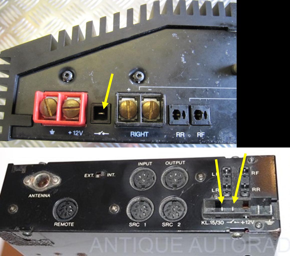 Am Radio dürfte der Stift mit dem Schaltersymbol der Ausgangs sein und an dem Booster ist es der Schalteingang. Wenn am Radio Schaltausgang 12V anliegen wird im Booster ein Relais geschaltet und der Booster mit Spannung versorgt. Hier fließt nur ein sehr geringer Strom. Eine 1A Angstsicherung sollte reichen, original war da warscheinlich garkeine drin.