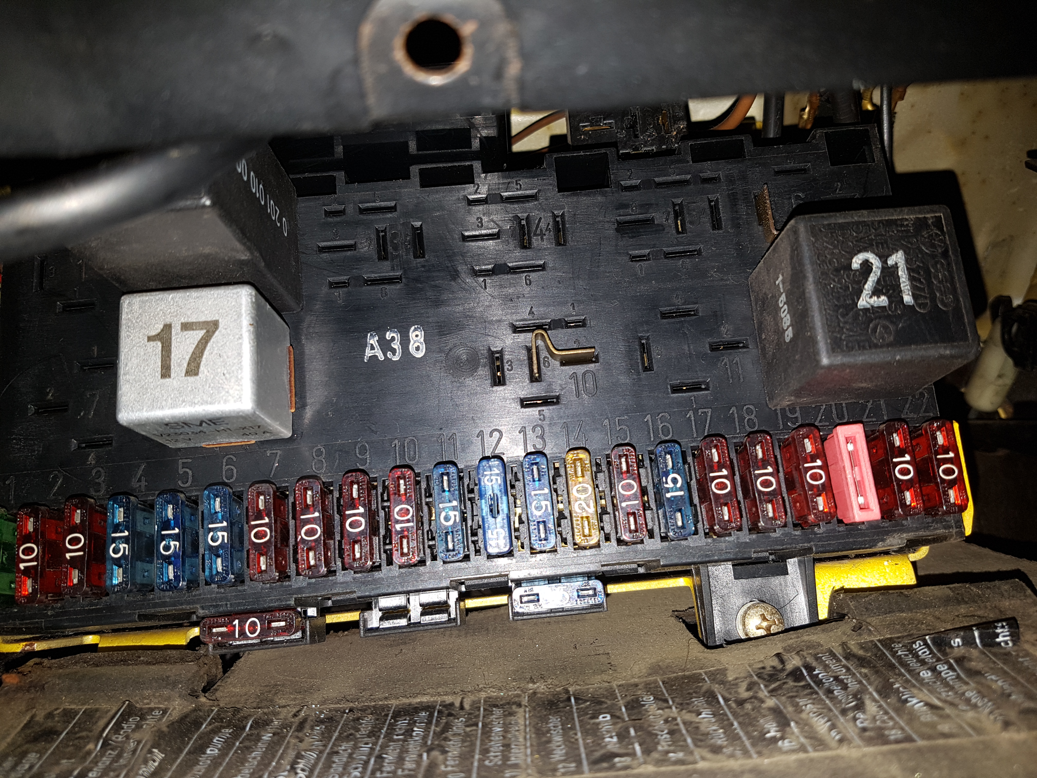 Auf Platz11 sitzt demnach das Relais für Heckwischer, auf der 12 das für Warnblinker. Eine Brücke kann oben rechts auf Platz6 sitzen bei normaler Hupe. Bei Zweiklang-Horn sitzt dort ein Relais, z.B. Nr. 53 bzw. 141951253B, Relais 40A.